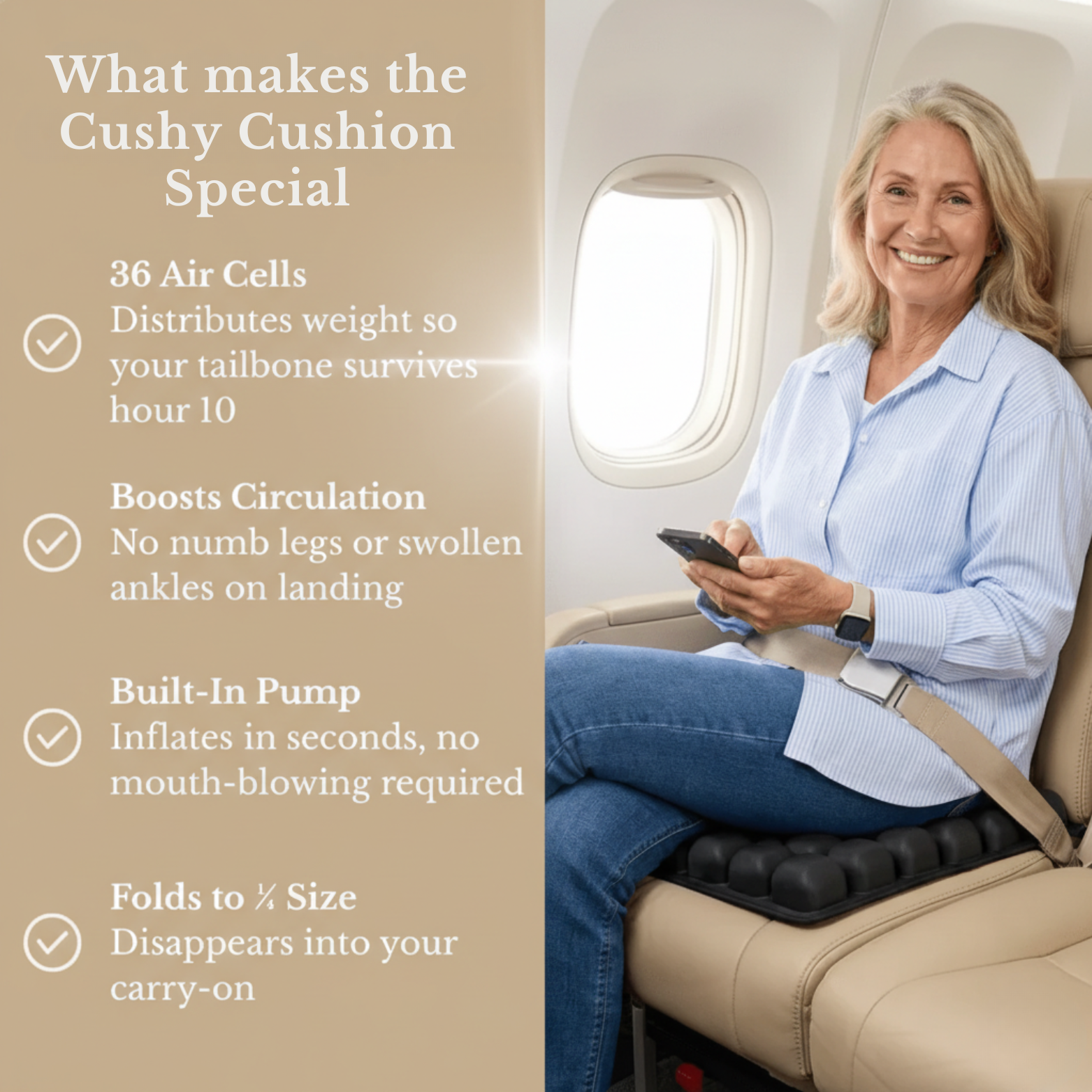 Yes. The cushion is designed to support your hips, lower back, and thighs—where pressure builds up the most during long periods of sitting. Many customers say it’s the first time they’ve felt real comfort after hours of travel.